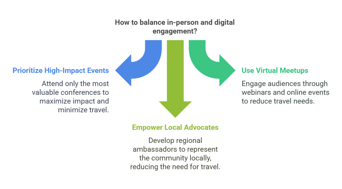 - Be selective with event attendance. Prioritize conferences or meetups that align with your community goals—and where your presence has real ROI.